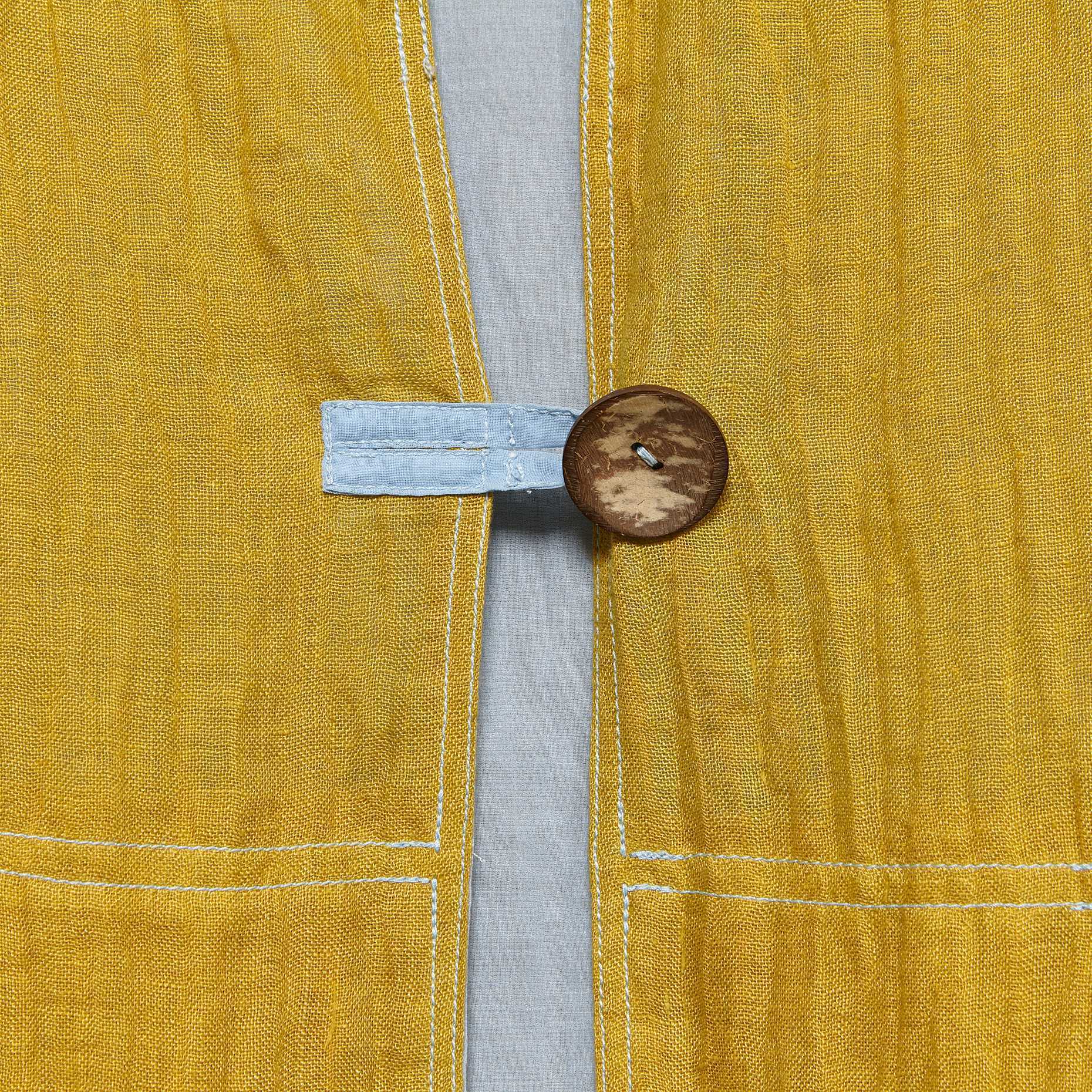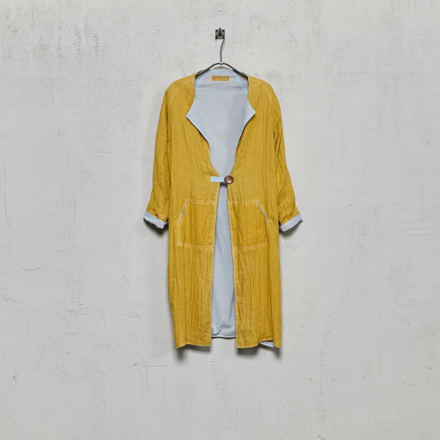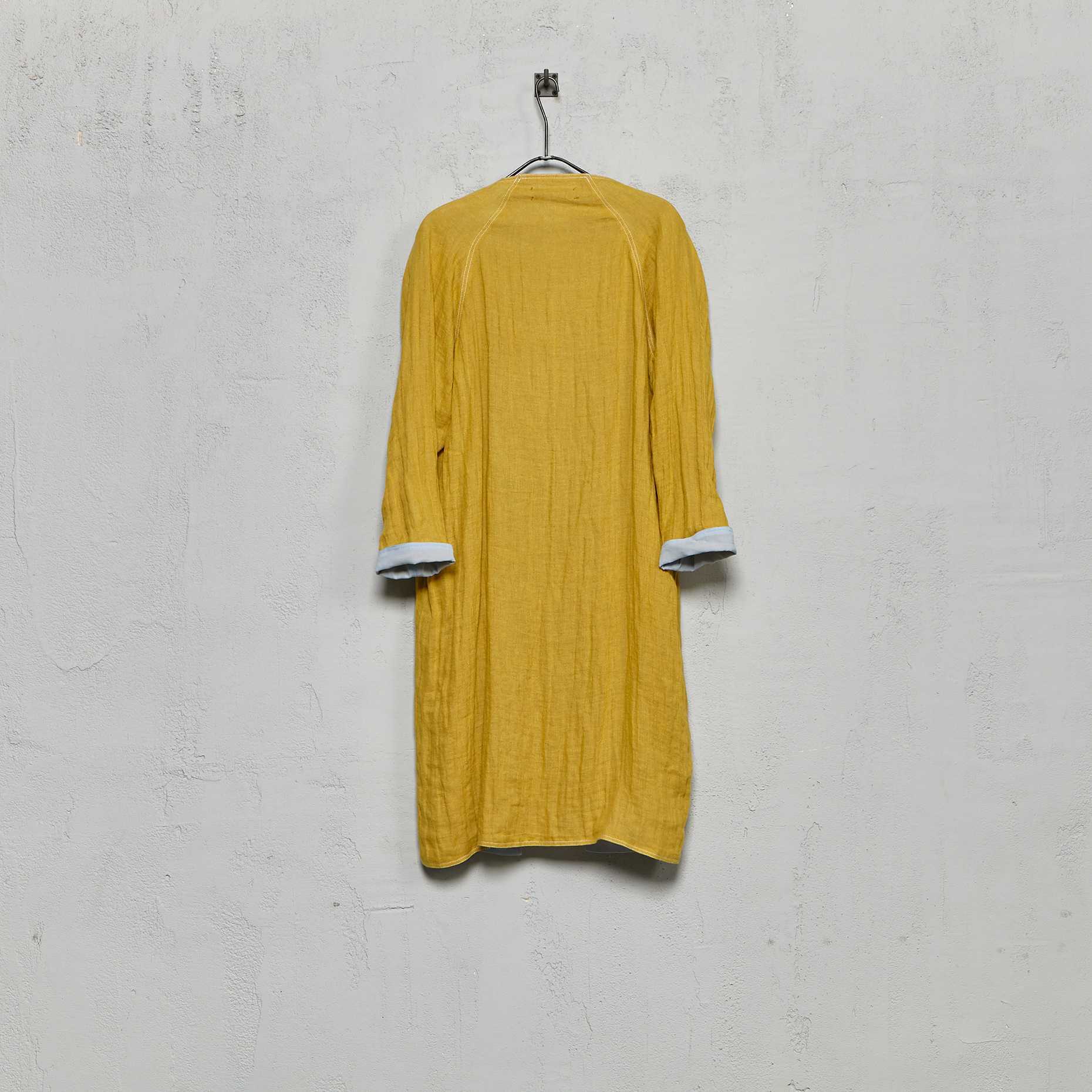 Anecho women's medium length collarless double layer overcoat in hand dyed Belgian linen with hand dyed Swiss cotton voile lining.