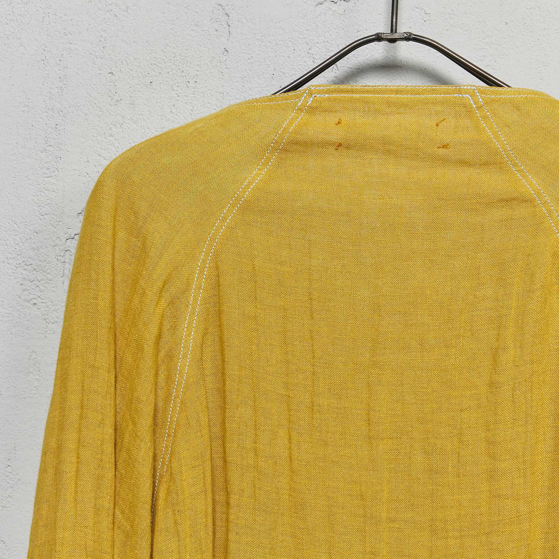 Features single button closure on front, raglan sleeve construction, slit raw edge front pockets, raw edge finish throughout and contrast topstitch detail. Hand set seams, machine topstitched only.