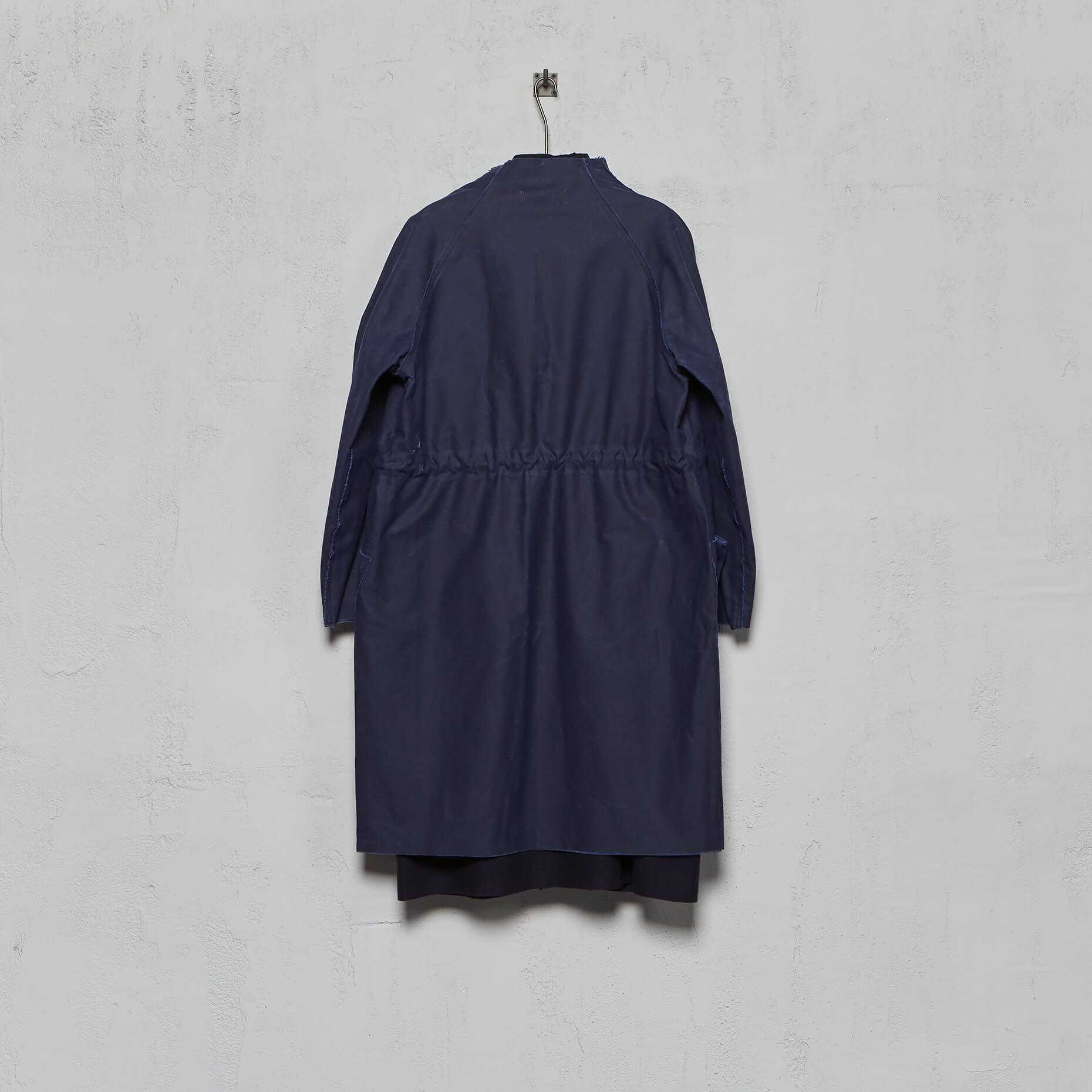 Outer shell features versatile funnel collar, raglan sleeve construction, drawstring waist with hand dipped Japanese Mokuba cord and two outer pockets with copper snap fastening.