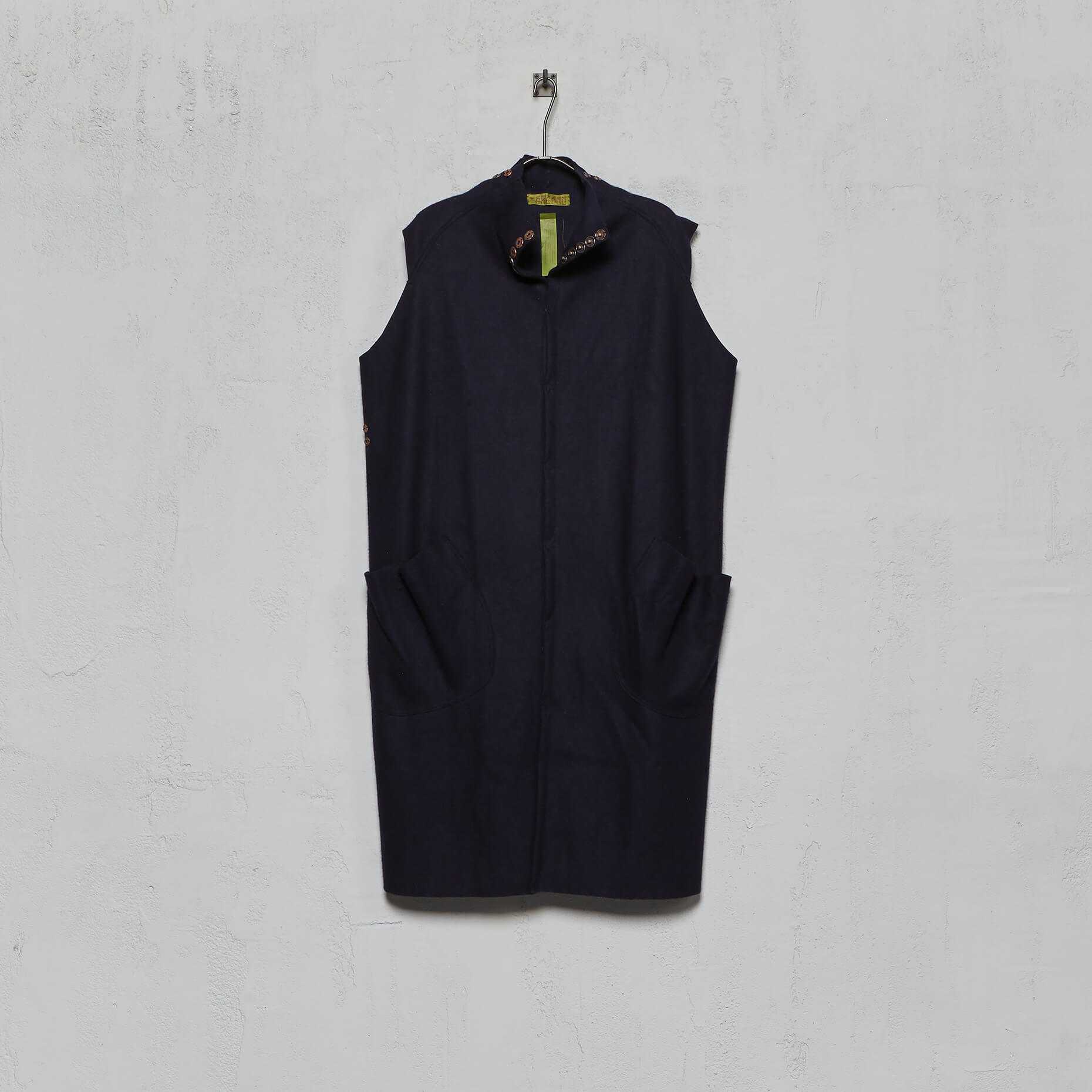Inner layer comprises long length sleeveless gilet in double faced cashmere. Features versatile funnel collar, raglan sleeve construction, two large front pockets, copper snap fastening, raw edge finish throughout.