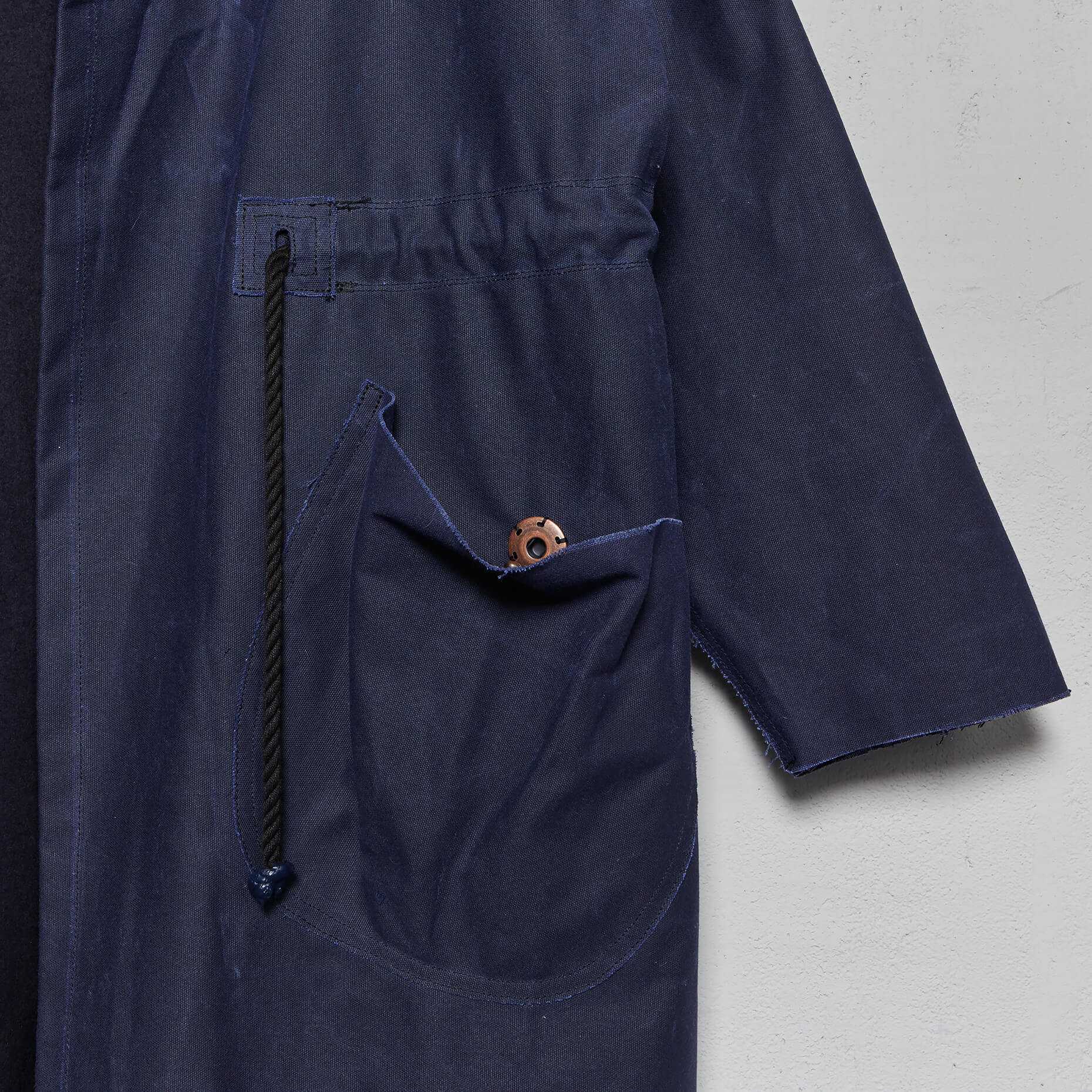 Anecho men's overcoat in double layer waxed Japanese cotton with detachable cashmere vest.