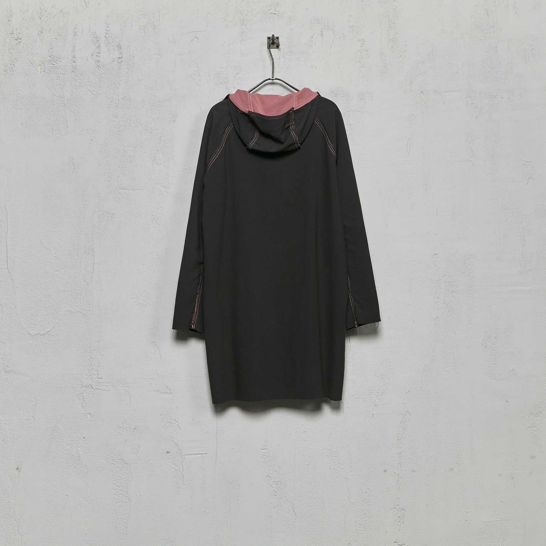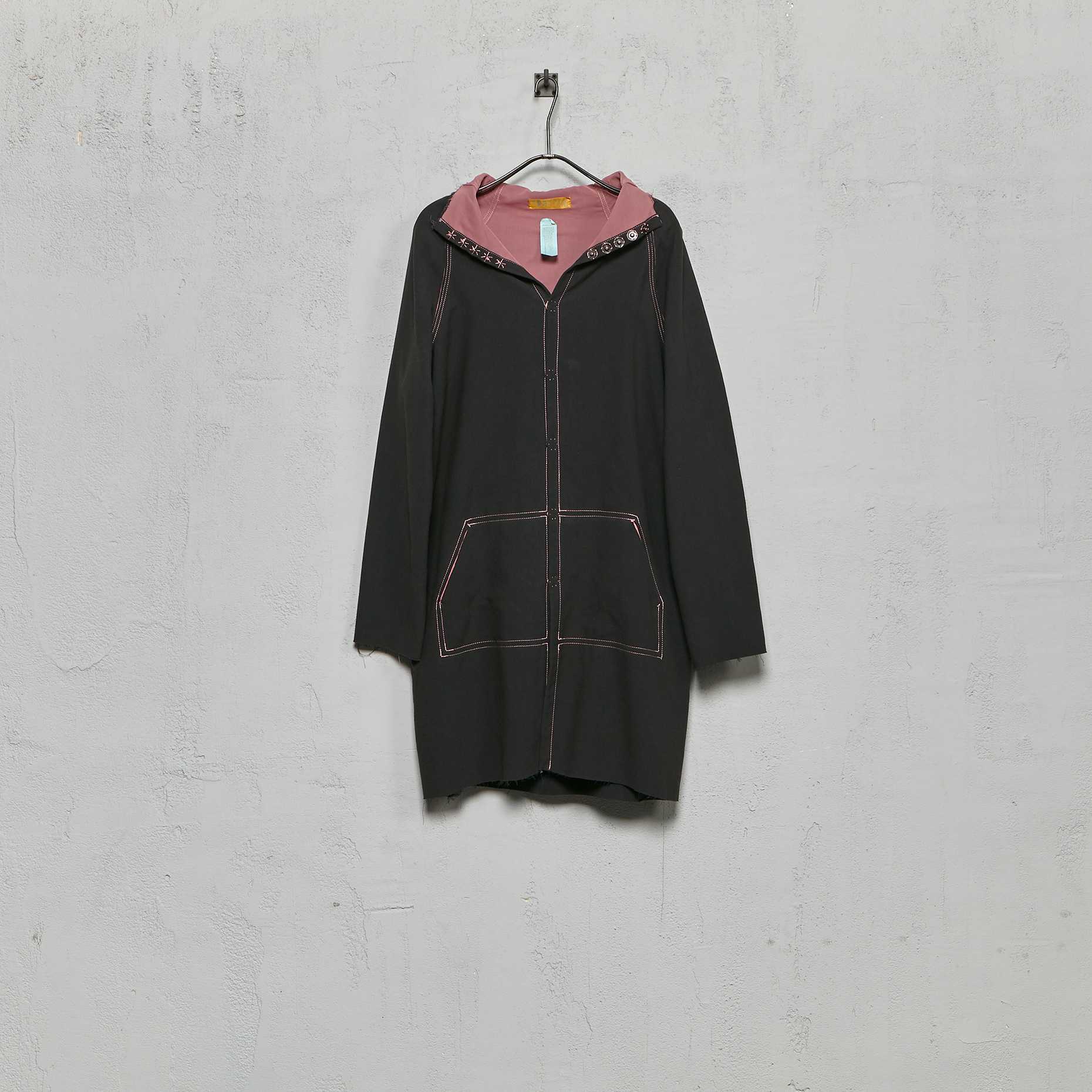 Features hood, high collar with five snap button closure, raglan sleeve construction, snap button closure on centre front, two slit raw edge pockets, raw edge finish throughout and contrast topstitch detail. Hand set seams, machine topstitched only.