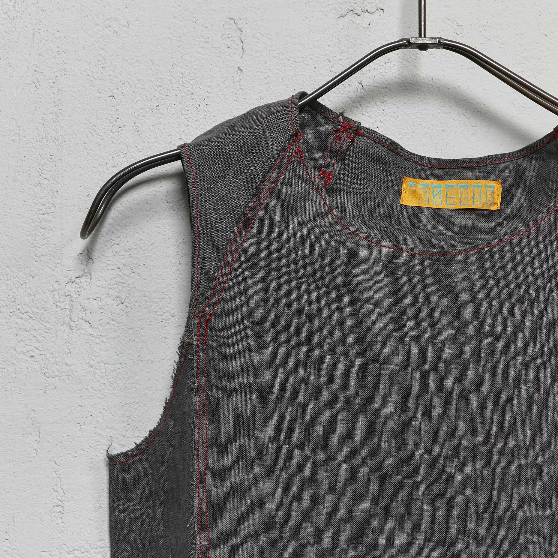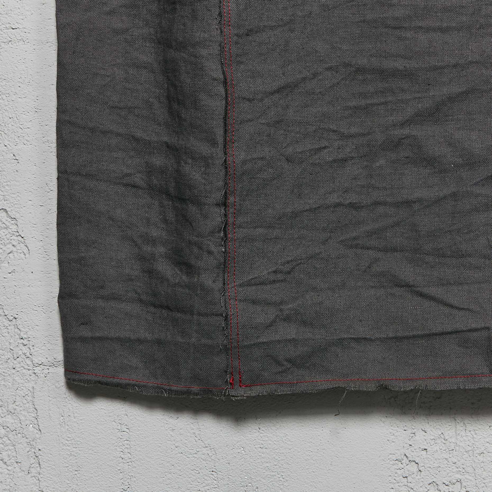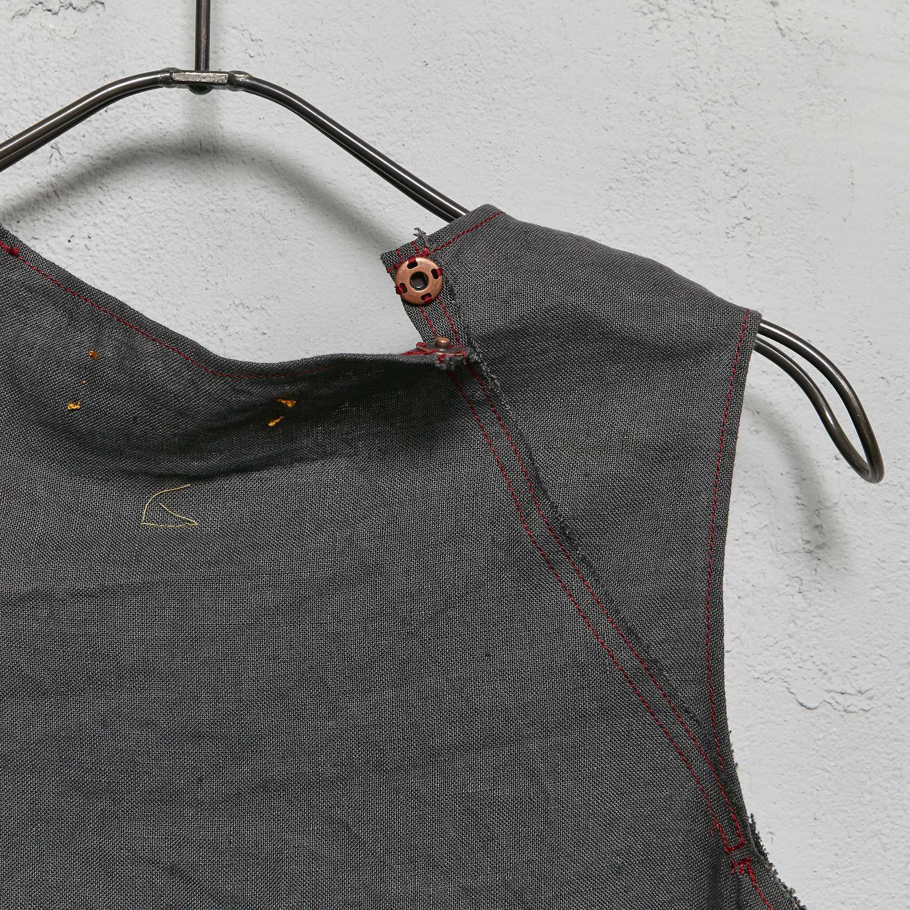 Features round neckline with copper snap fastening, raglan sleeve construction, raw edge finish throughout and contrast topstitch detail. Hand set seams, machine topstitched only.