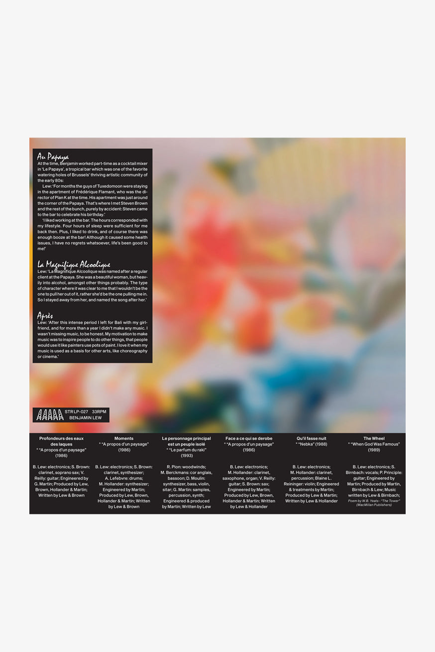 “Benjamin Lew was an enlightened amateur, in the noble and almost Renaissance-like sense of the word: he dabbled with equal grace in photography, writing, visual arts ... and worked part-time as a cocktail mixer in a tropical bar which was one of the favourite watering holes of Brussels’ thriving artistic community of the early ‘80s. Tuxedomoon had just moved to Brussels, and Steven Brown was among the many musicians, designers & artists who patronized the bar. Benjamin had a secret passion: he wasn’t a musician, but had acquired a small analog computer, with which he had started creating these strange mysterious little pieces. Benjamin played them to Steven and asked him if he’d agree to record with him. Steven was taken with them and accepted. The Douzième Journée was largely created in the studio by both protagonists, with the help of Gilles Martin and myself, in the spring of ‘82. Listening to his albums (he went on to record four more with Crammed) is like embarking on a dream journey to the Sahara or the Far East. You’d think that some of the pieces feature non-European musicians or samples but: no... this is just Benjamin’s imagination, his synths, and his friends…” Marc Hollander, Feb. 2019”