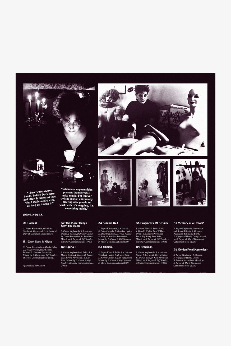 Centring on the work of Stephanie Payne, who conceived Dark Arts with friends in Columbus, OH, 1983, and remains its sole member, ‘Reflections in a rear view mirror’ supplies a necessary overview of the act between their 1991 debut album and occult ambient practice of 2008. Theirs is a classic tale rooted in a medium-sized town, where music and its associated culture provided a portal for youthful energies to sync in and drop out; from playing in Toy Division - a Joy Division covers band using toy instruments - to DJing and booking bands at the local “cool” venue, Crazy Mama’s; and eventually signing off a letter and demo to Steve Albini, who would sign their first 12”, ‘A Long Way From Brigadoon’ to his Ruthless Records in 1985. From here they would play support for Big Black, and their influences only grew to encompass krautrock, ambient, folk, and spiritual musics, leading o the conception of the band heard on this record.