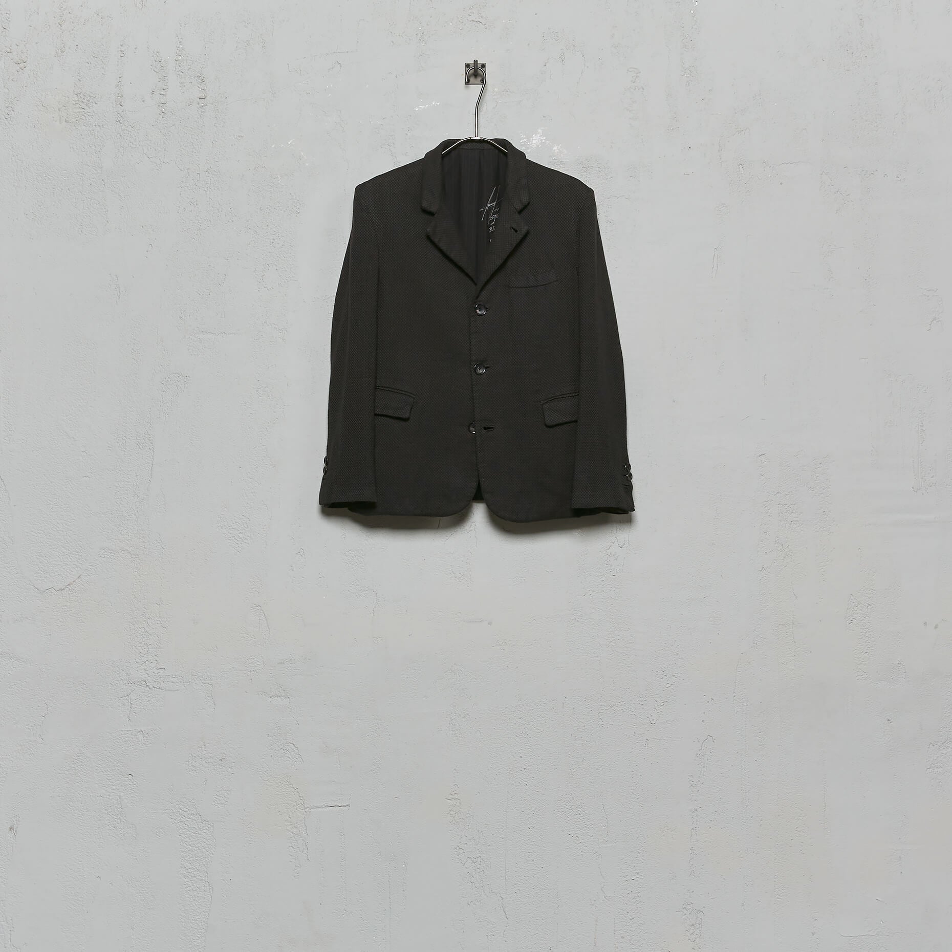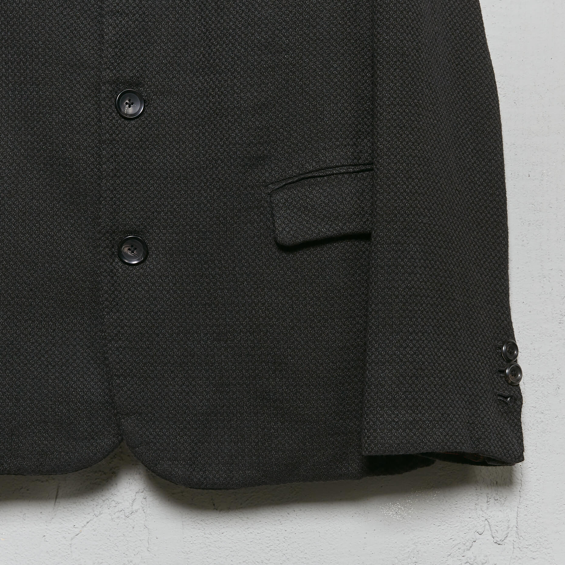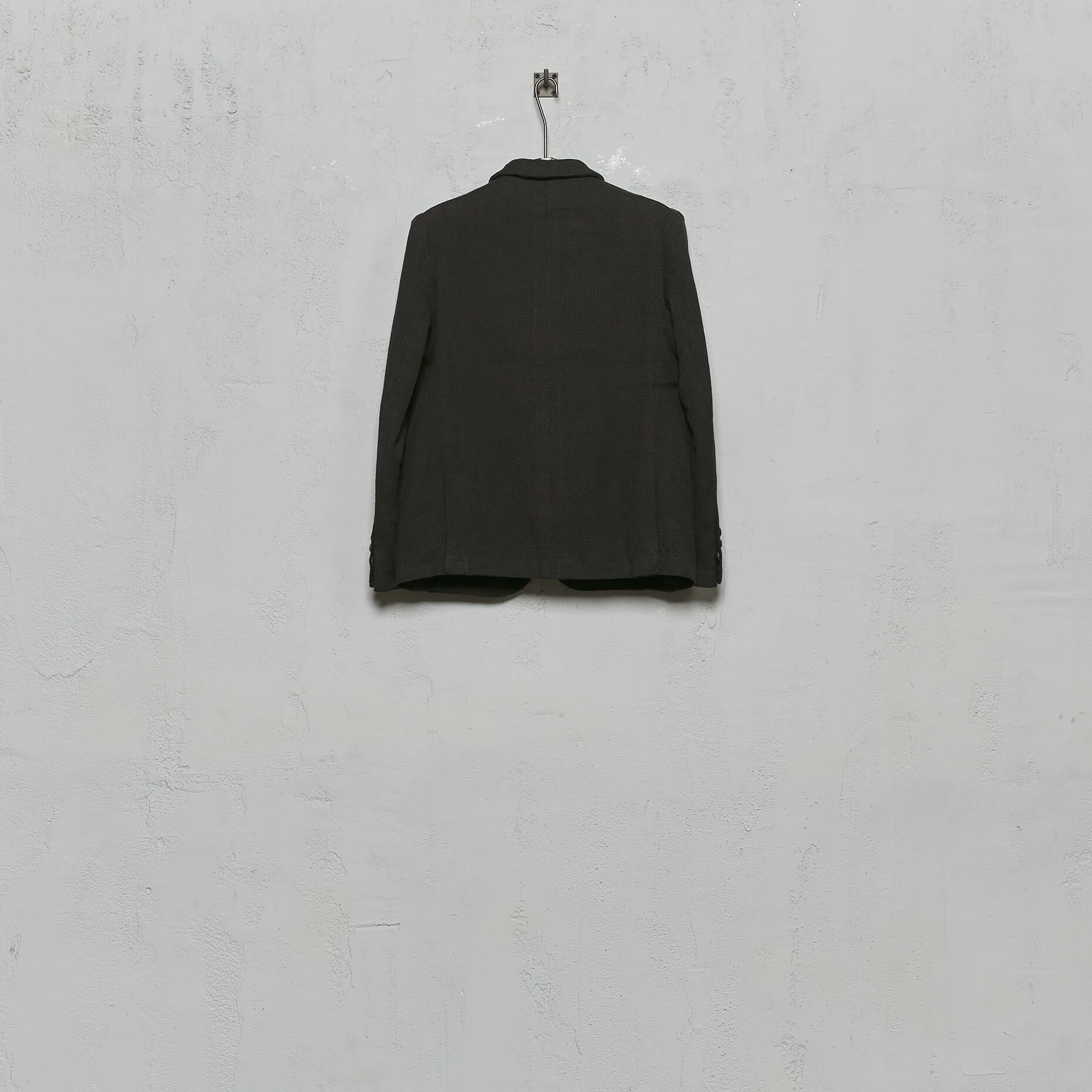 Created from Small's original GBS designer's personal clothing program classic single-breasted notch-lapel double vent jacket pattern from Small's extensive tailoring research, cut in hand dyed special linen and cotton 'Locri' weave fabric created exclusively for Small by Luigi Parisotto, the world's leading research fabric designer and weaver in Sarcedo Vicenza, combined with specially felted Biella super 120's extra fine Tasmanian wool stripe lining story with a beautiful geometric jacquard weave viscose sleeve lining made for Small by Ezio Ghiringhelli in Varese.