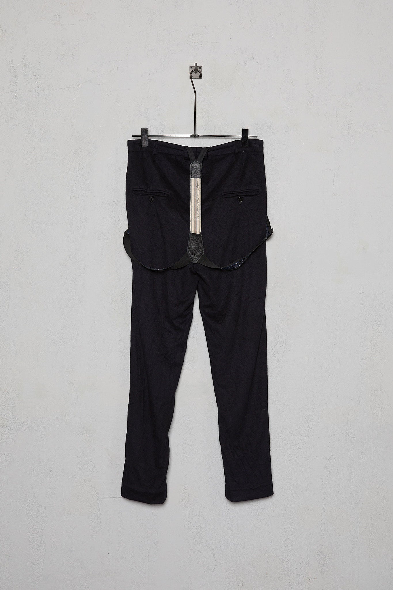 Features hand cut vintage leather suspenders, generous 2.5cm seam allowances, remarkable artisan-made horn buttons created exclusively for Small by the legendary Fontana family of buttonmakers in Parma, Italy, and six real hand stitched buttonholes in pure silk Bozzolo Reale Milano Seta thread, each one requiring at least 8-10 minutes to cut and sew.
