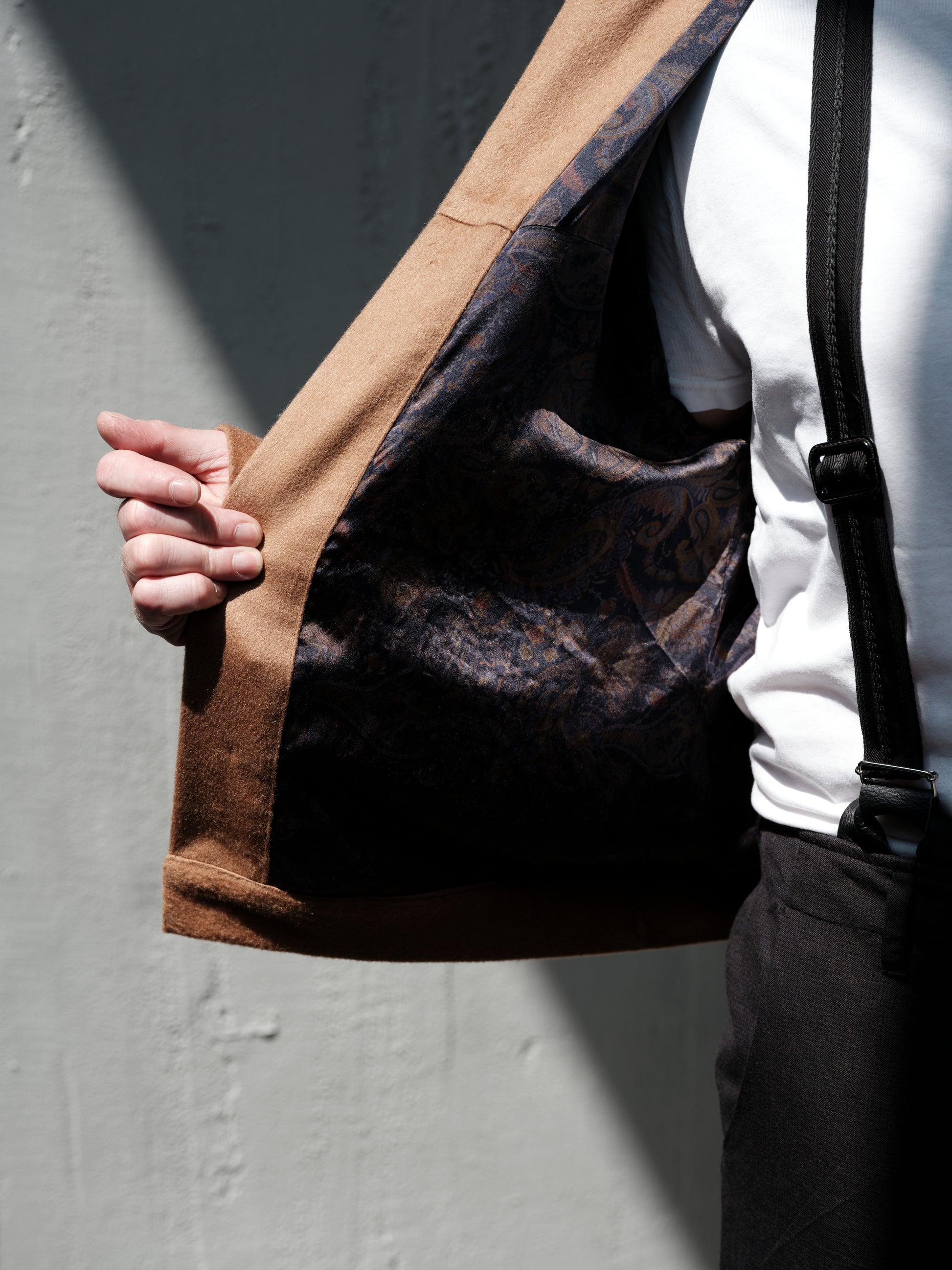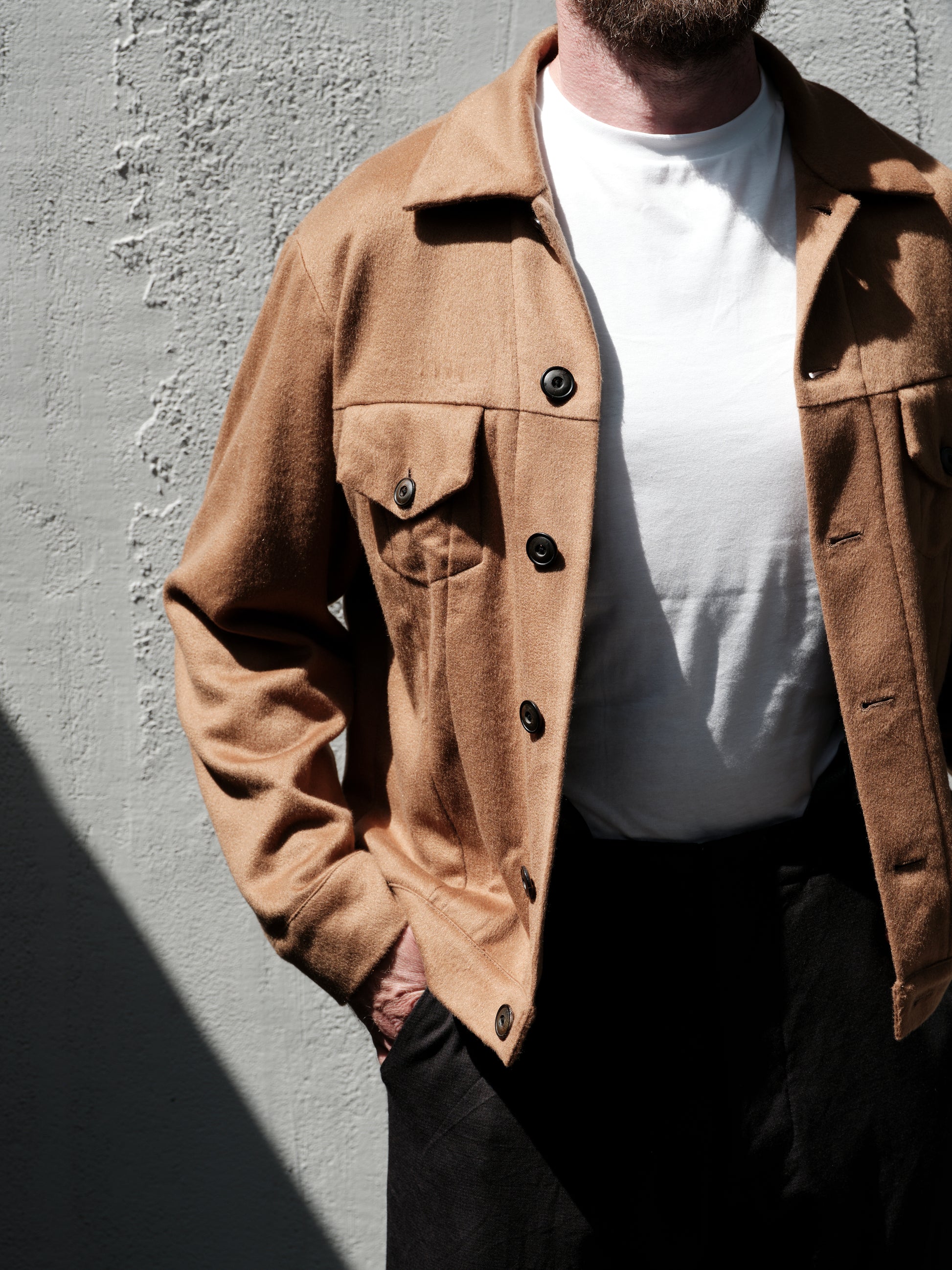 Created from Small's American jeans jacket pattern from his extensive tailoring research, cut by hand in 2-ply Alashan Breath cashmere coating cloth in Biella, Italy. Combined with a pure silk raso satin lining made by the Brenna family in Como.