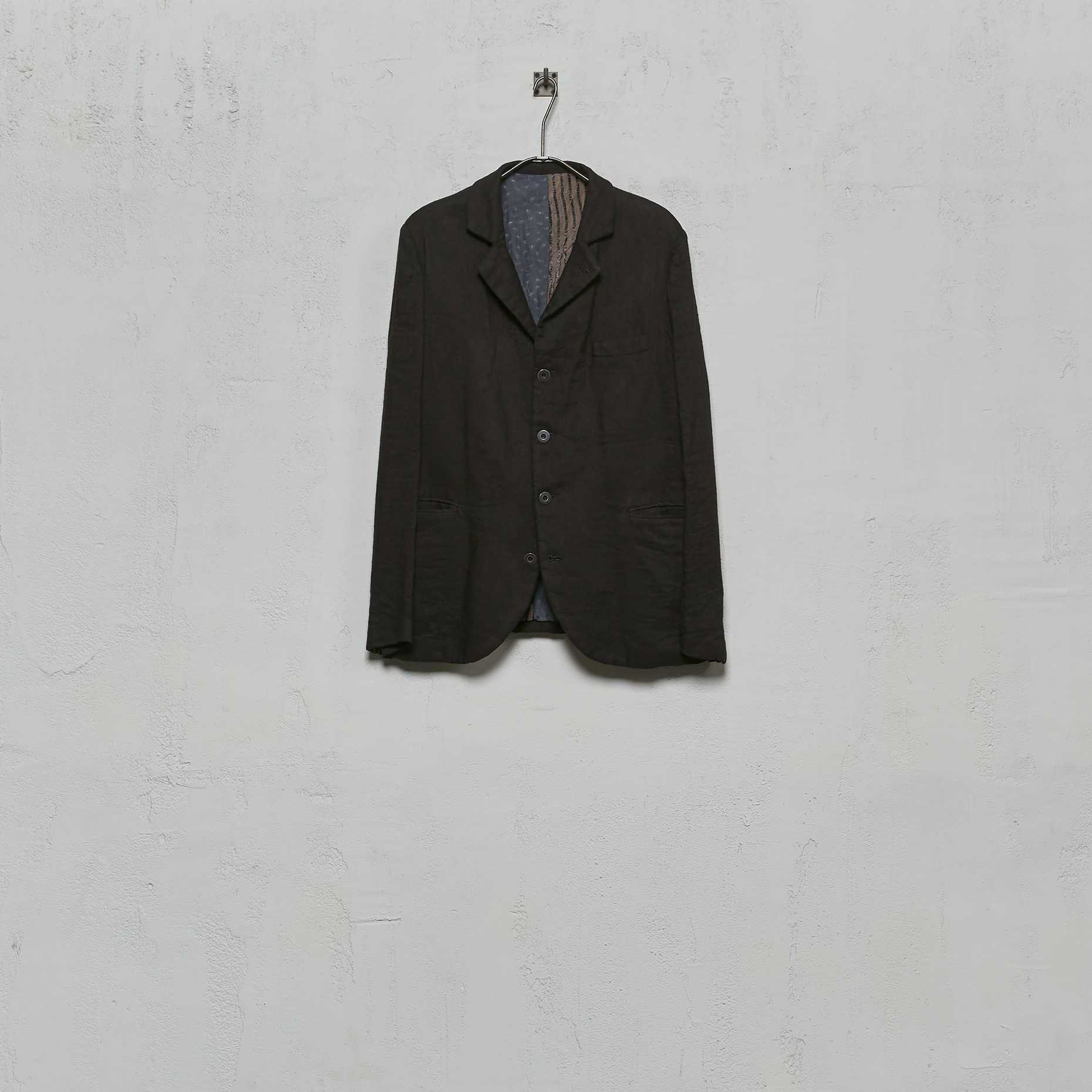 Geoffrey B. Small men's 4 button jacket in hand dyed Luigi Parisotto silk, cashmere, and linen fabric.
