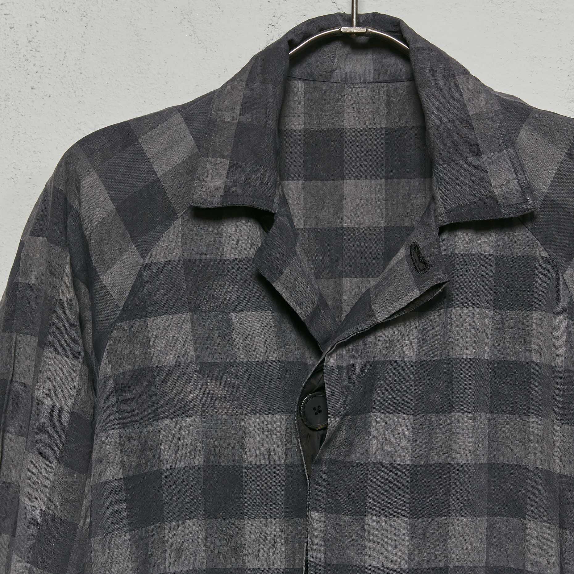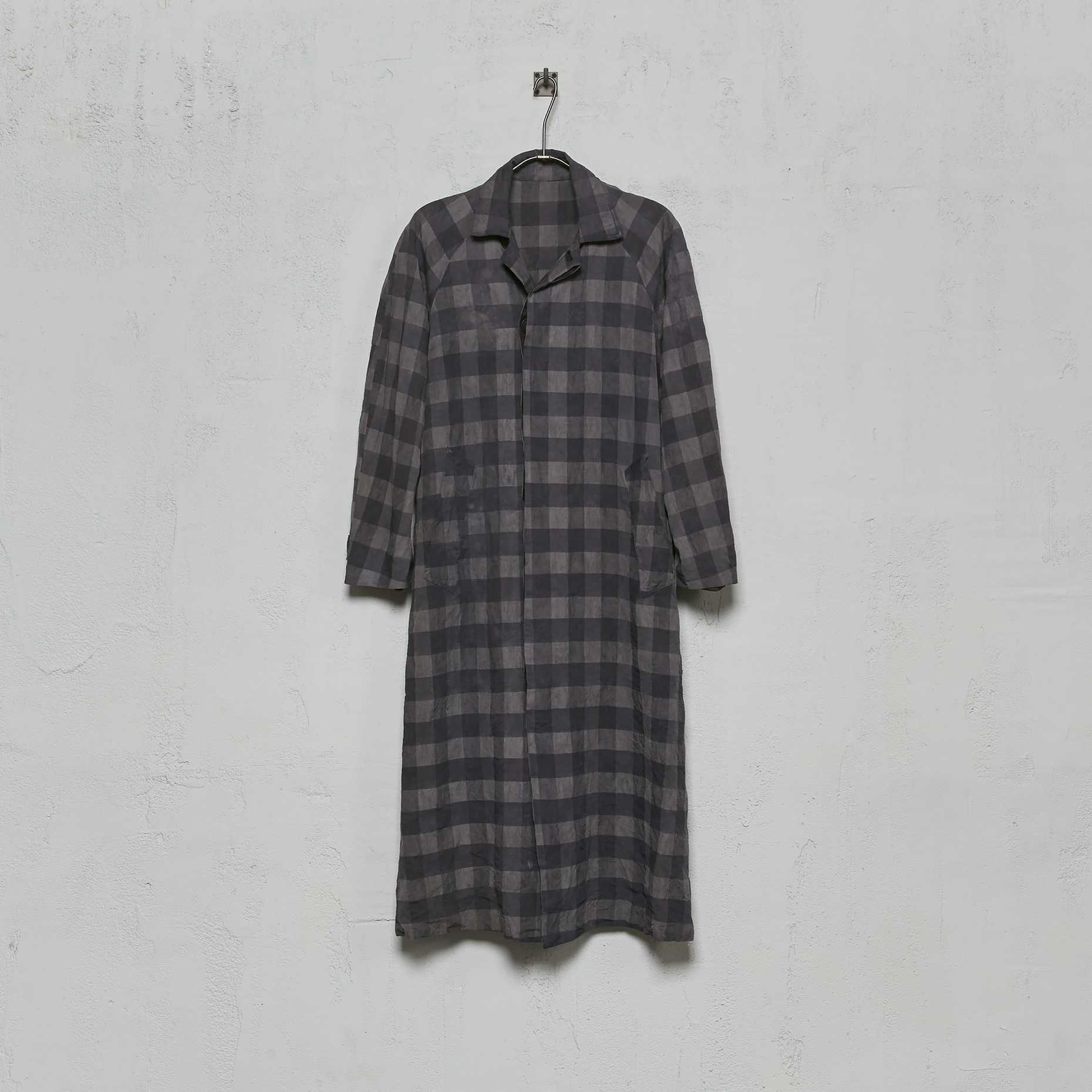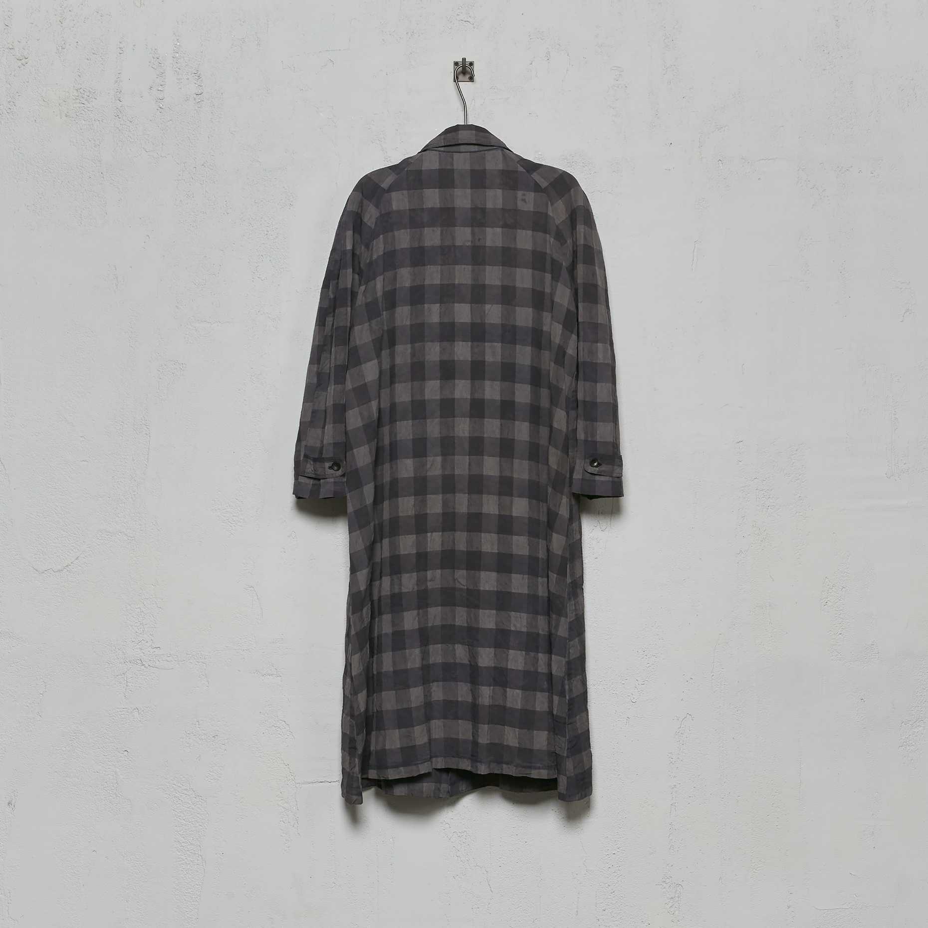 Geoffrey B. Small oversize duster coat in natural hand dyed Luigi Parisotto luxury 'Drake' variable tension plaid weave silk, cotton, and linen.