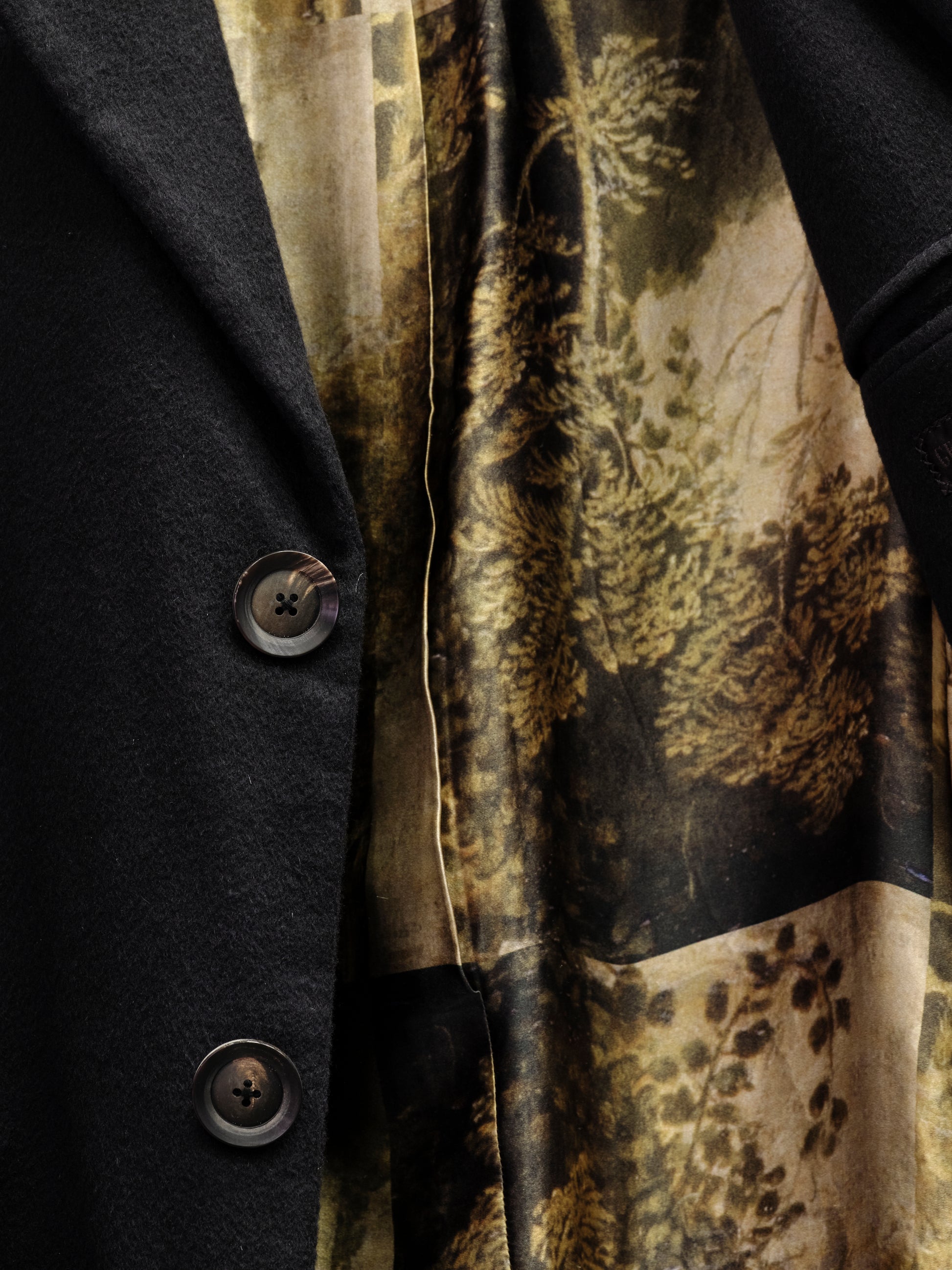 Created from Small's single breasted 3 button, notch-lapel class long coat pattern from his extensive tailoring research, cut by hand in supersoft pure Alashan cashmere suiting cloth woven in Piacenza 1733 in Biella, combined with pure silk raso satin lining made by the Brenna family in Como.