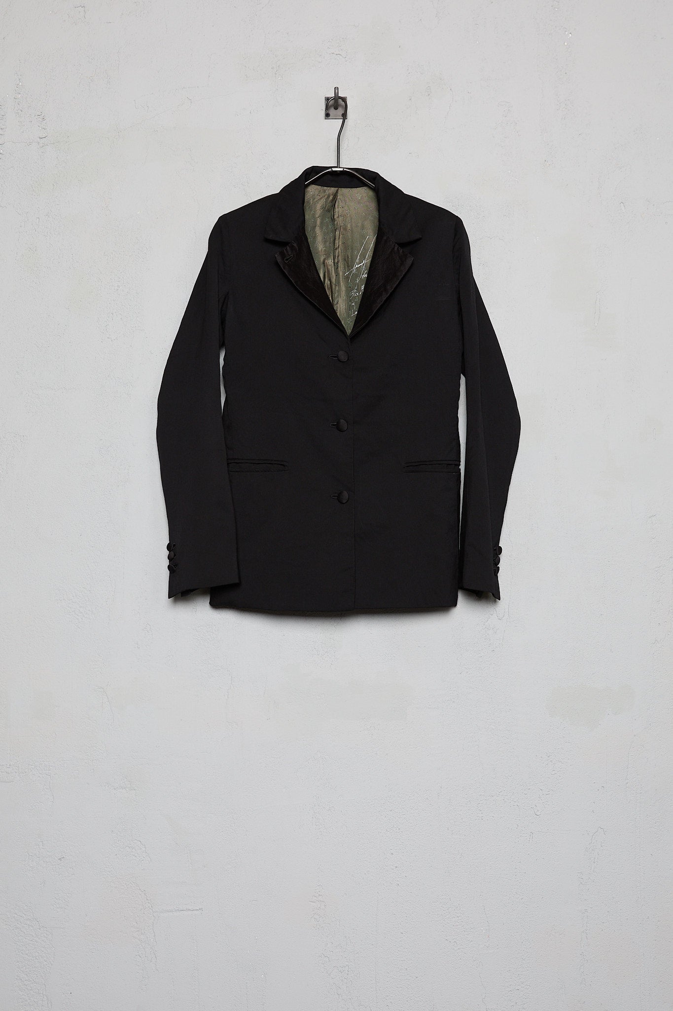 One of three pieces in the world, exclusively for Blue Mountain School, the jacket is cut from an original women’s smoking jacket pattern, from extensive tailoring research. The design features a squared bottom, surgeon’s cuff sleeves, and a notched lapel.