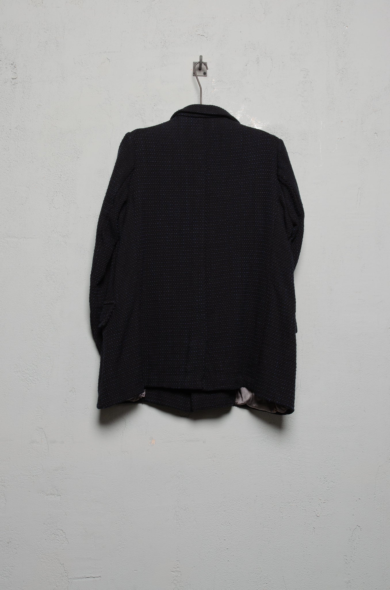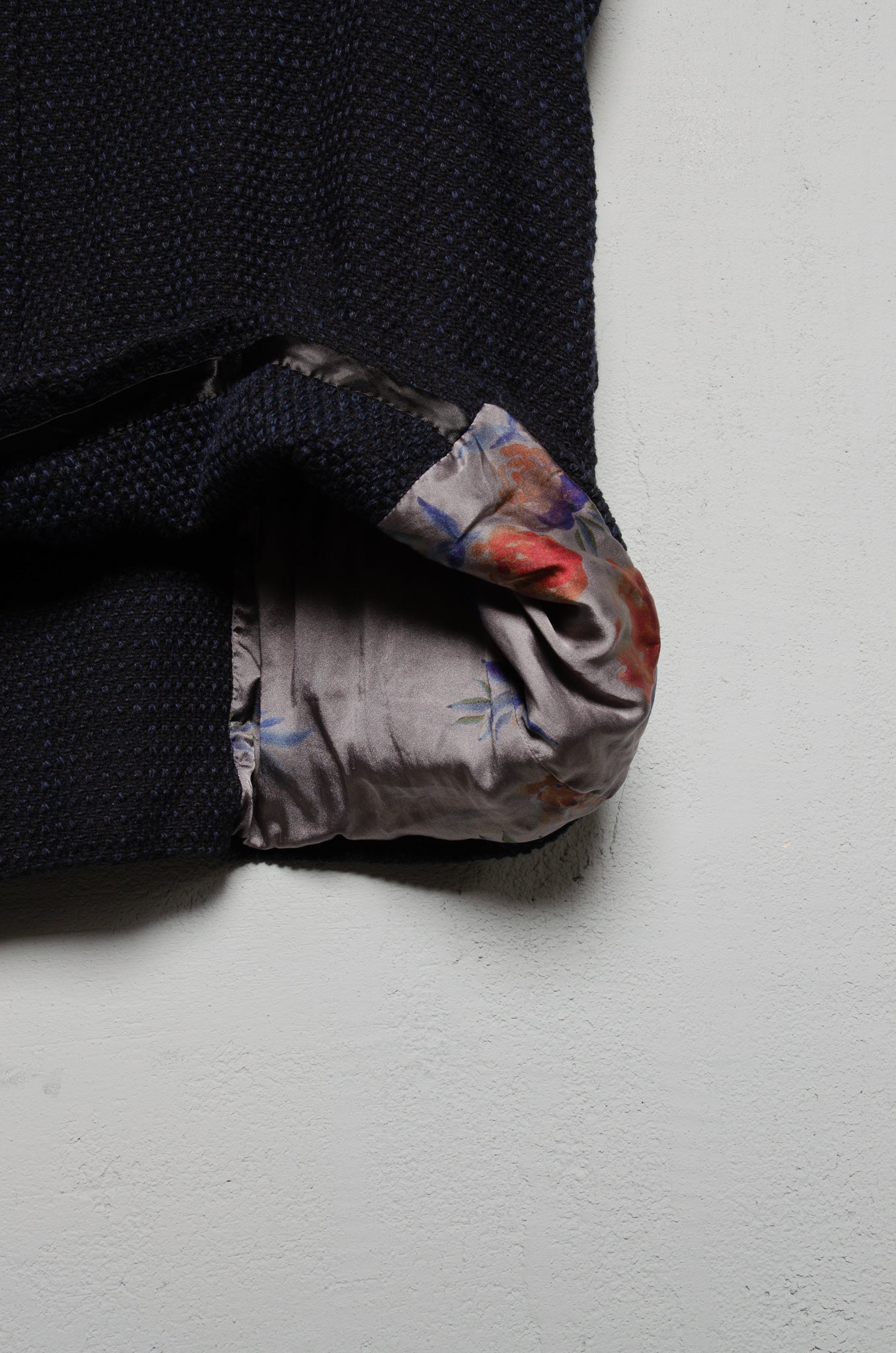 Created from Small's original 5-button single breasted notch-lapel A Line short coat pattern from Small's extensive tailoring research, cut in a hand woven cotton and linen basket weave fabric woven by the Colombo family at Tessitura La Colombina at Badoere di Morgano, combined with a pure silk floral lining woven in Como, Italy.