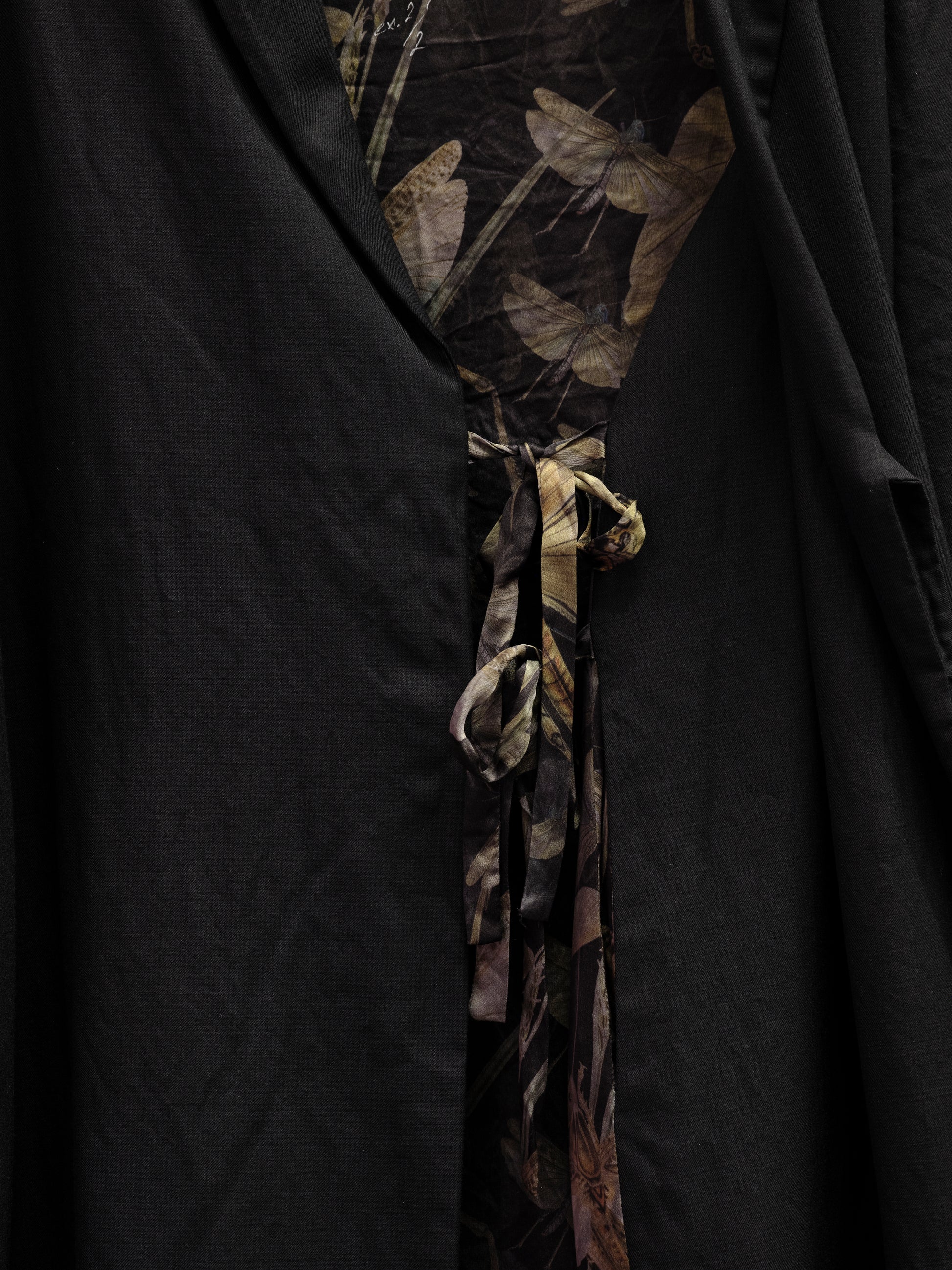 Created from Small's original kimono pattern from his extensive tailoring research, cut by hand in luxurious Super 130s Houndstooth wool woven in in Biella. Combined with pure silk raso satin 'black locust' print lining made by the Brenna family in Como, Italy.