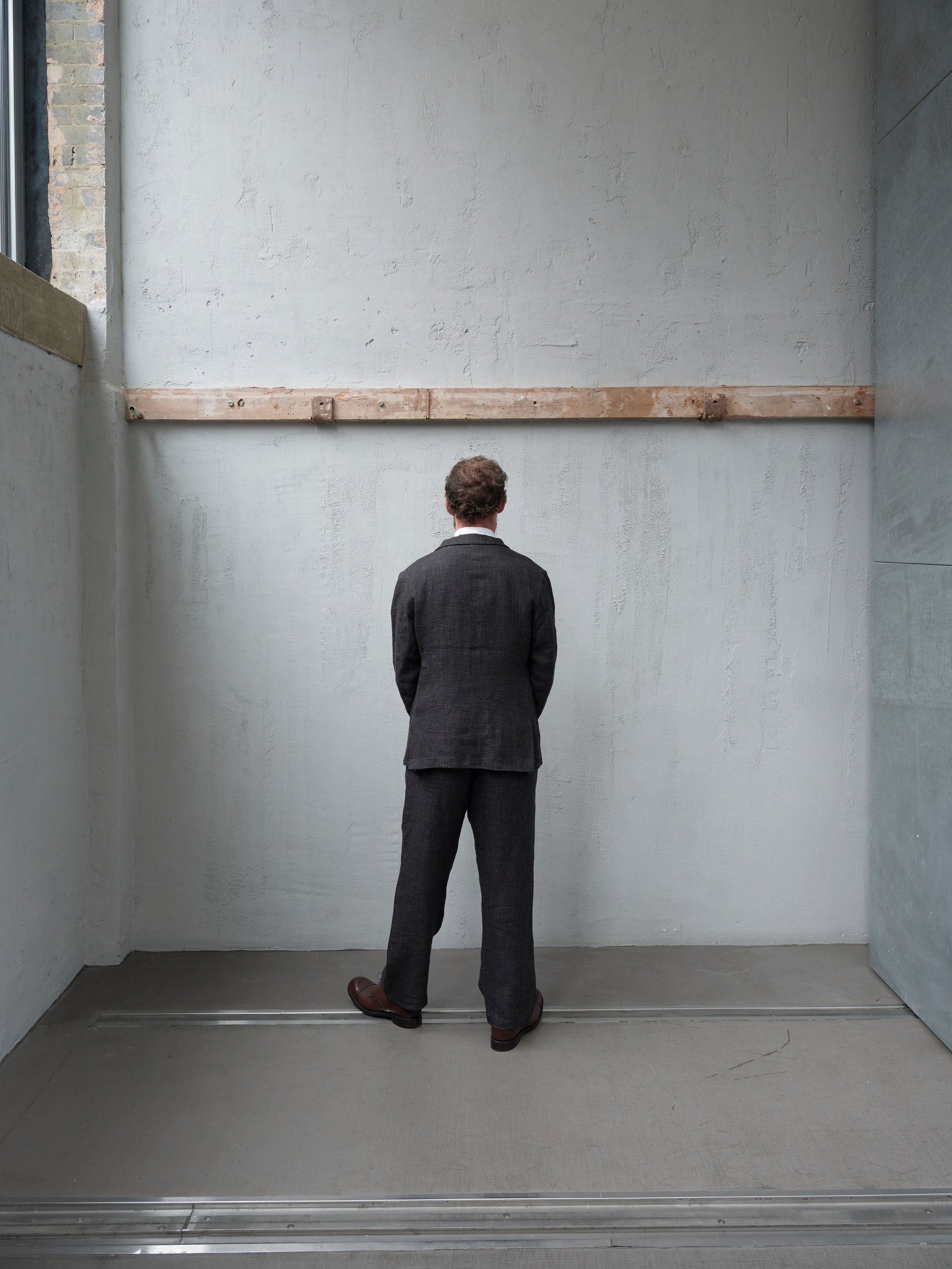 Created from Small's extensive tailoring research, cut by hand using textured wool & linen 'Armageddon' plaid cloth woven for Small in Sarcedo, Vicenza by Luigi Parisotto, and part-lined with pure silk raso satin paisley print shirting made in Como by the Brenna family. The fabric is treated by hand in Small's workrooms in Cararzere Venezia for extra aging, drape and softness.