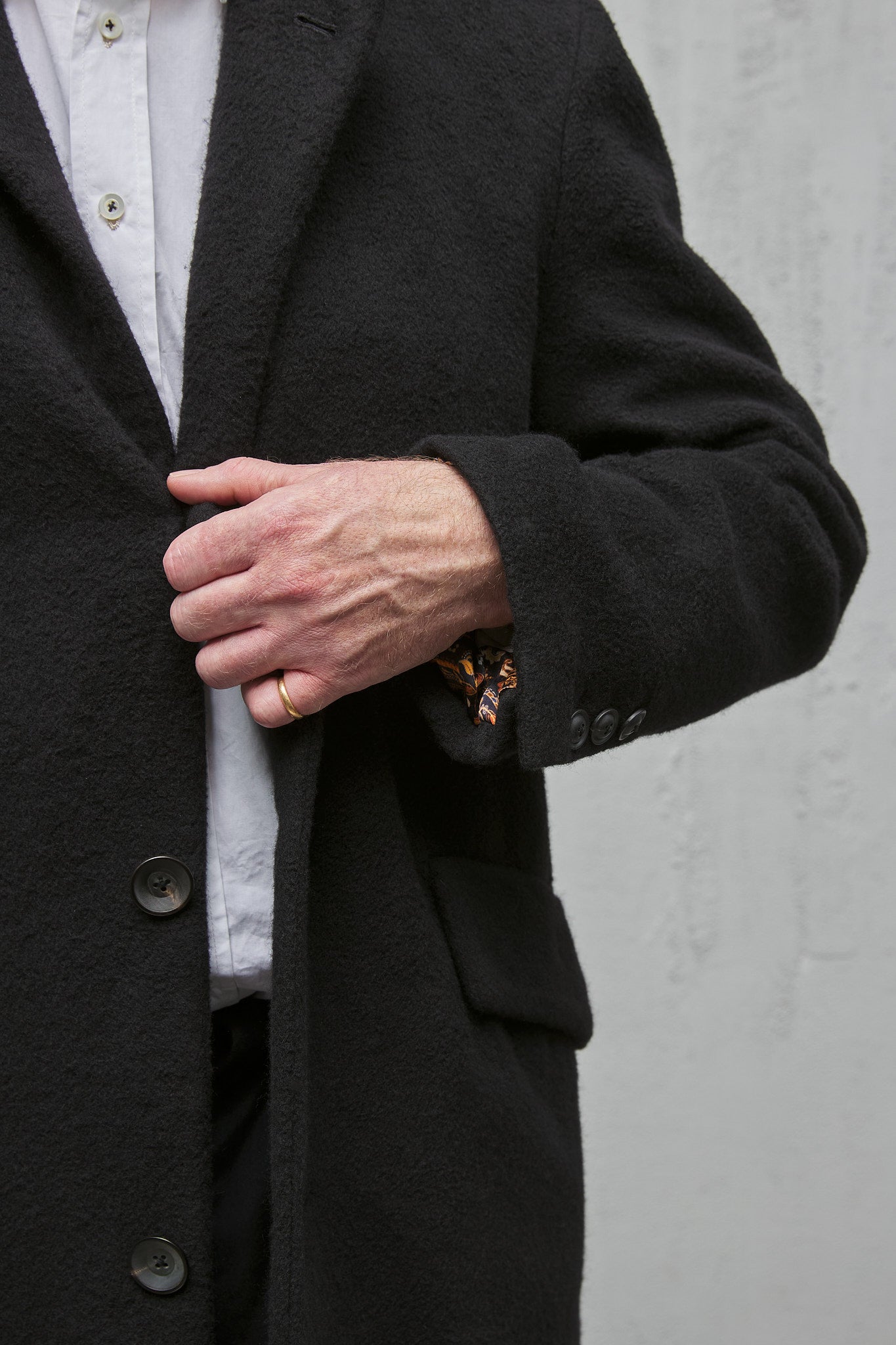 Geoffrey B. Small men's 3 button long coat in Piacenza 1733 pure 3-ply Alashan cashmere.