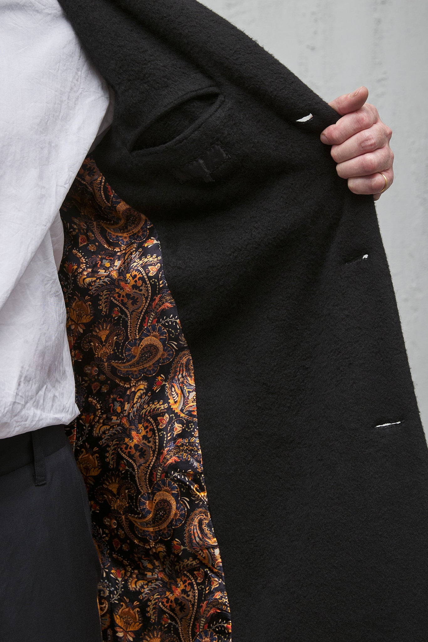 Created from Small's single-breasted, 3-button, notch lapel long coat pattern from his extensive tailoring research, cut by hand in ultralux 3-ply Alashan cashmere, woven in Biella, Italy. Combined with a pure silk raso satin lining made by the Brenna family in Como.