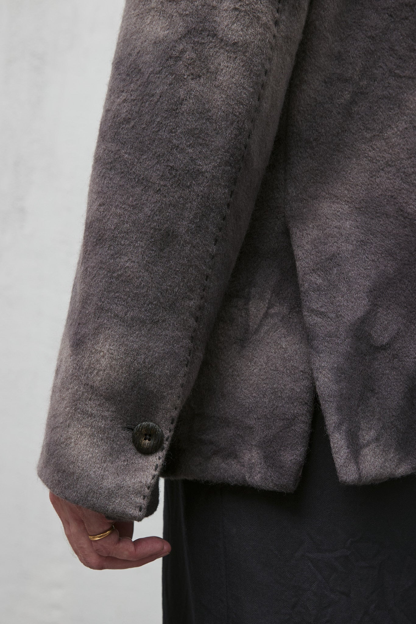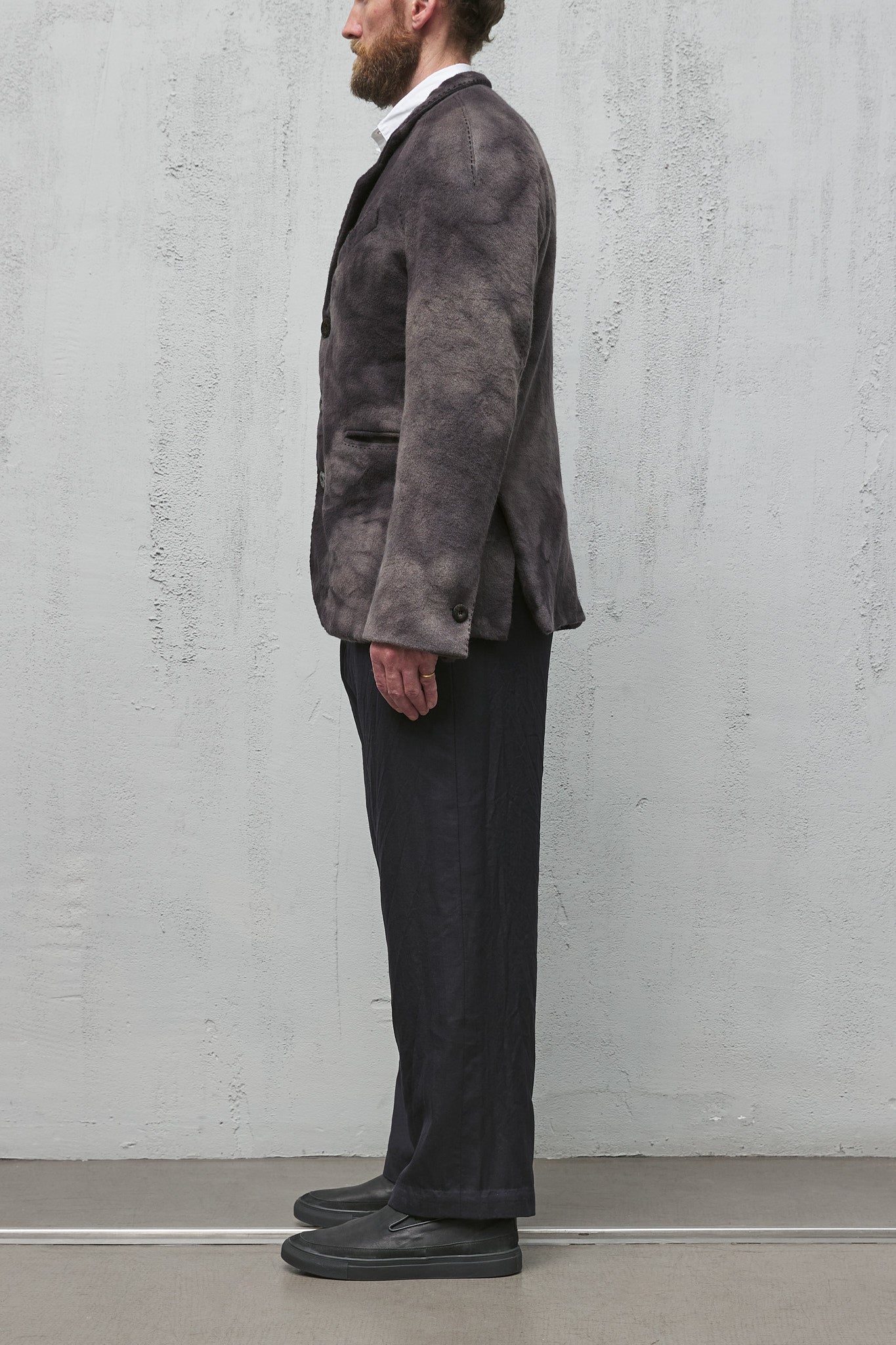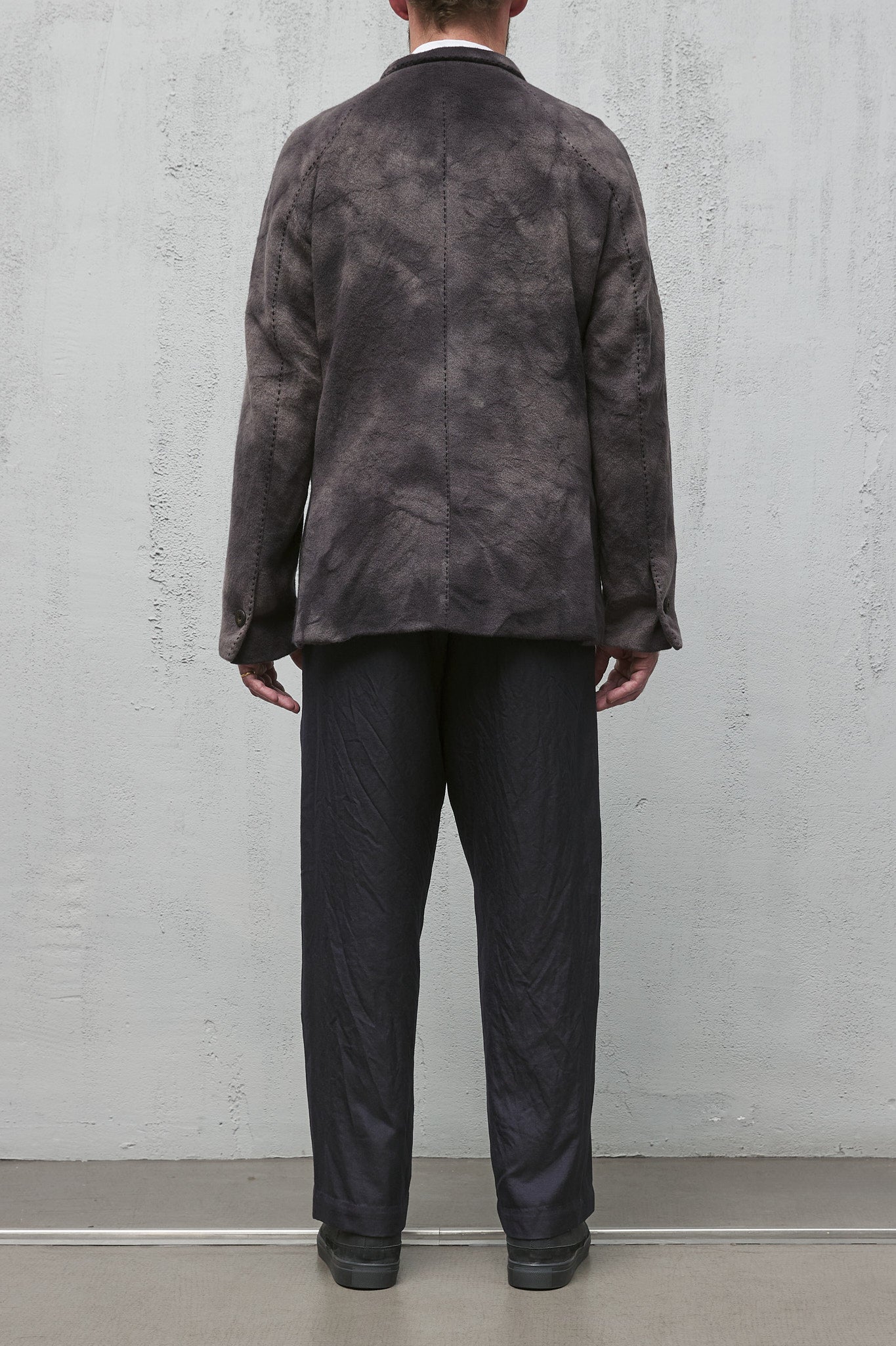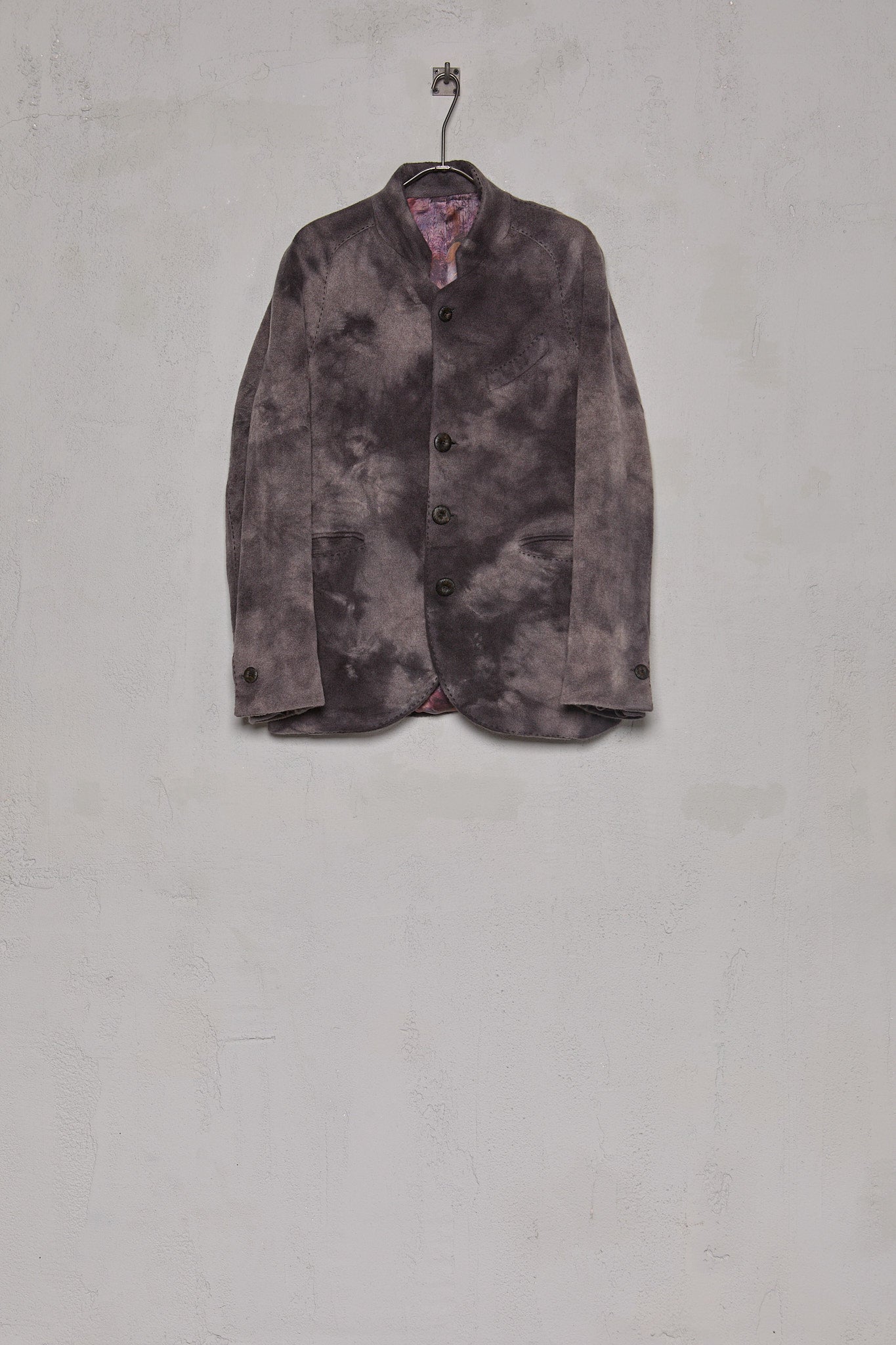 The jacket is then hand-washed and dyed in Cavarzere, Venice, in the GBS super workrooms, using an 'accident' dye process, which required over 2 days work to achieve the characteristic mottled colouring, softness, and shape.