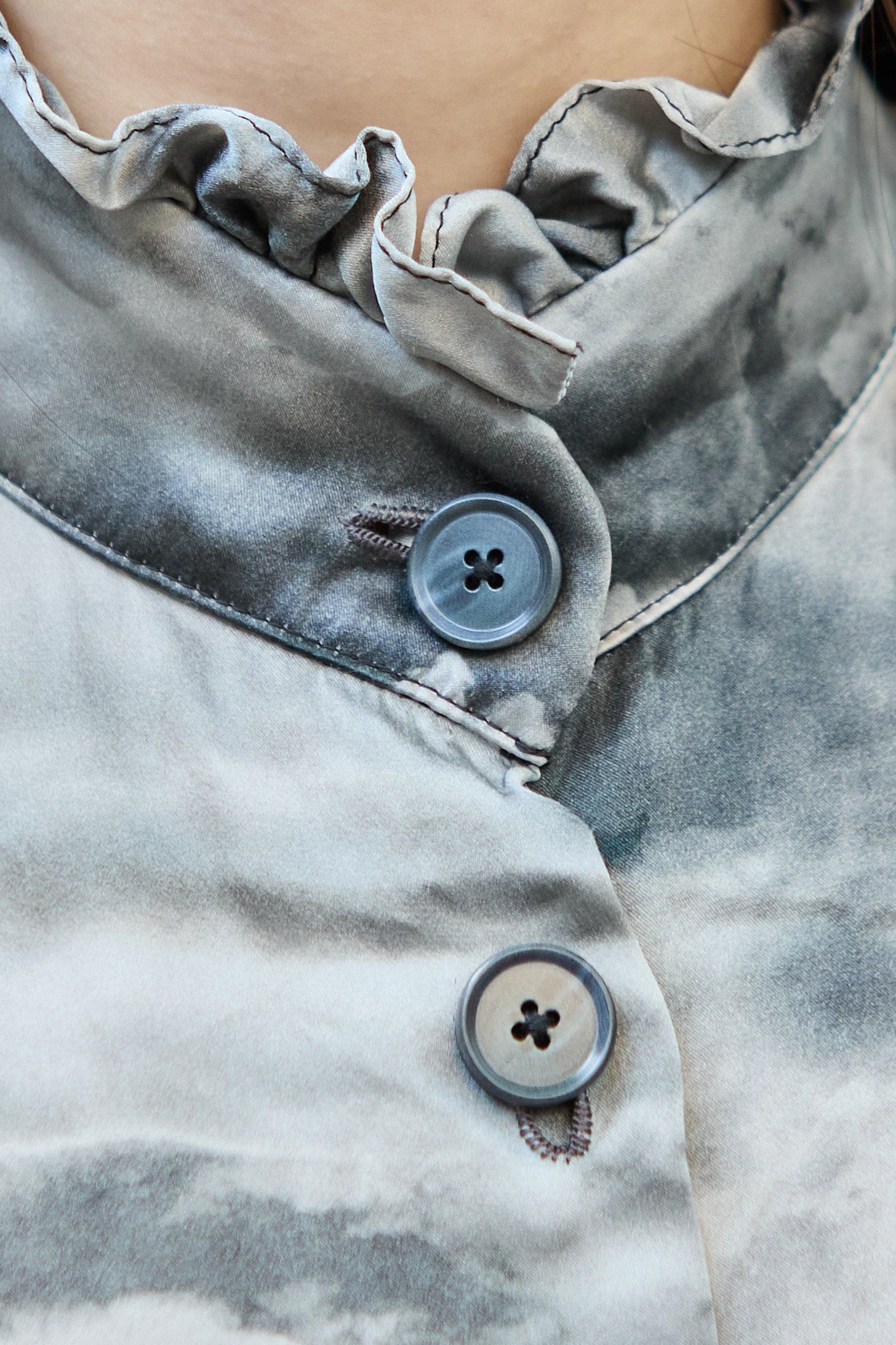Cut from 16-momme pure Como silk raso satin cloth, made exclusively by the Brenna family of Como, the shirts are individually hand-dyed in Cavarzere - a process requiring 8 hours of expert work to achieve the colour, patina, and softness of the garment. The Clouds print was developed by the artist LAS.